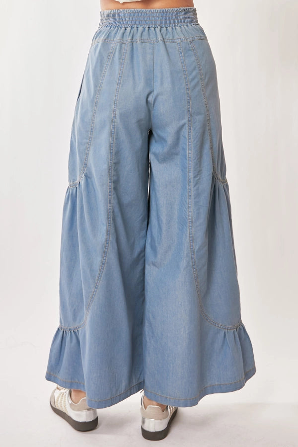 Discover our tiered wide leg denim pants, designed with a flattering high waist and flowing silhouette that combines comfort with style. Featuring gathered seams and subtle flared hems, these versatile bottoms bring an effortless charm to everyday wear.