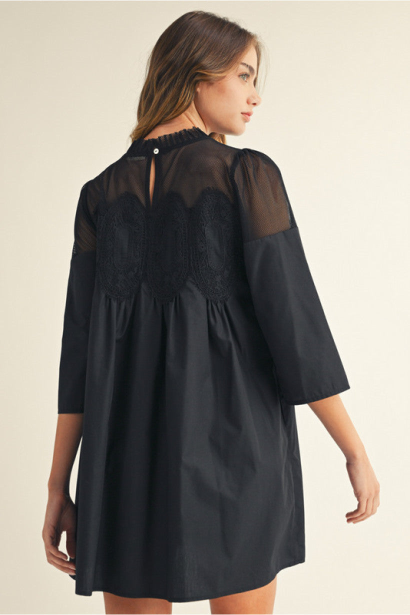 3/4 sleeves babydoll dress with mesh contrast, crochet lace trim accent, side pockets, button closure back.