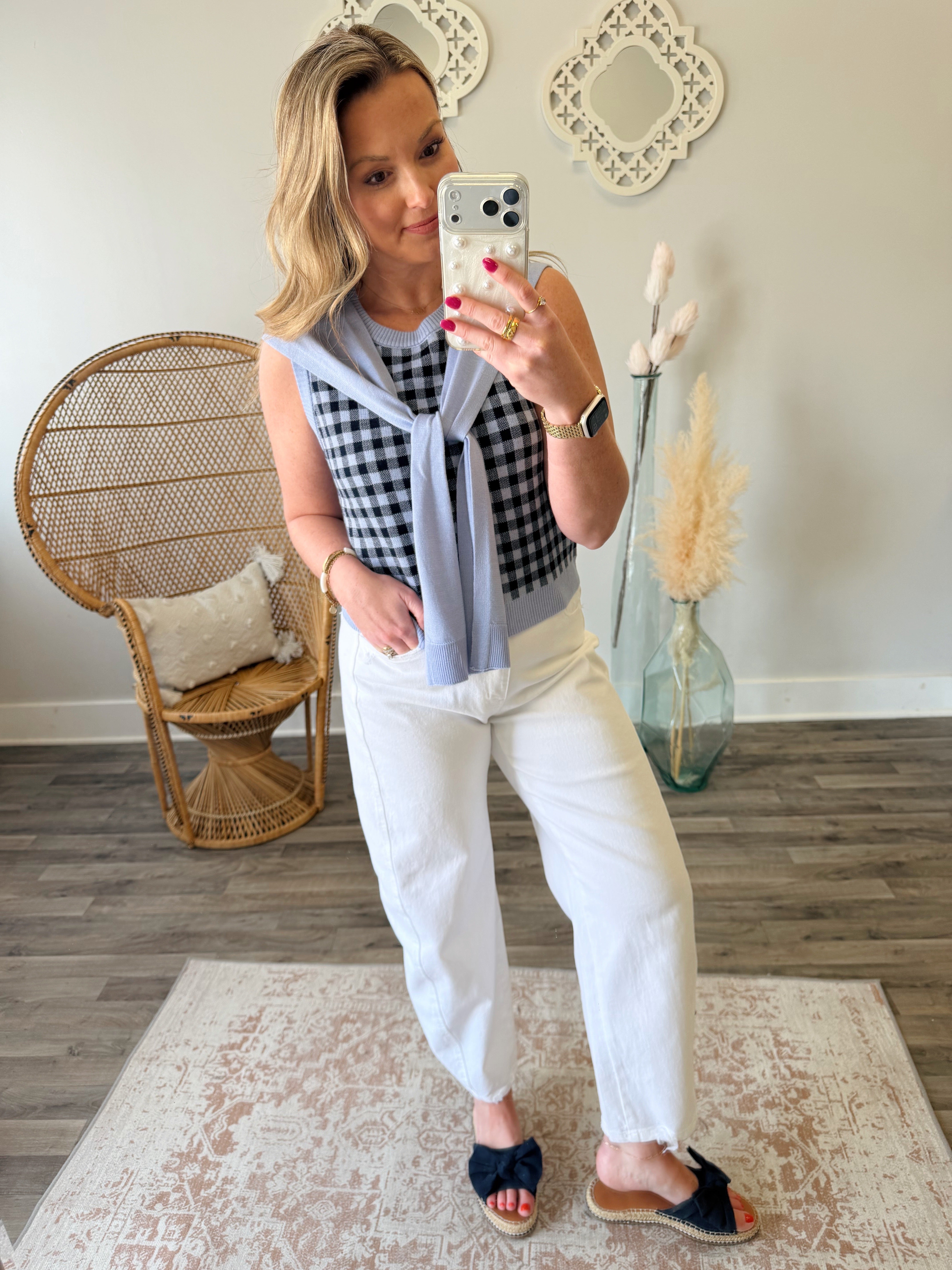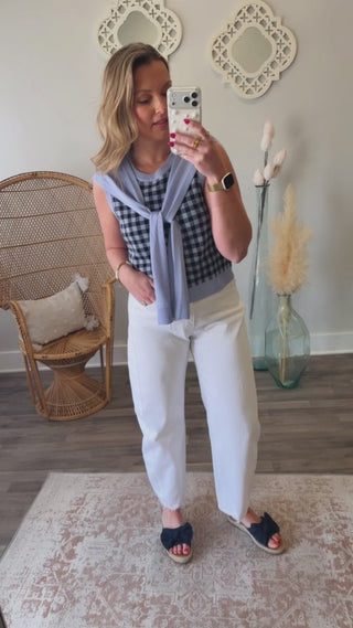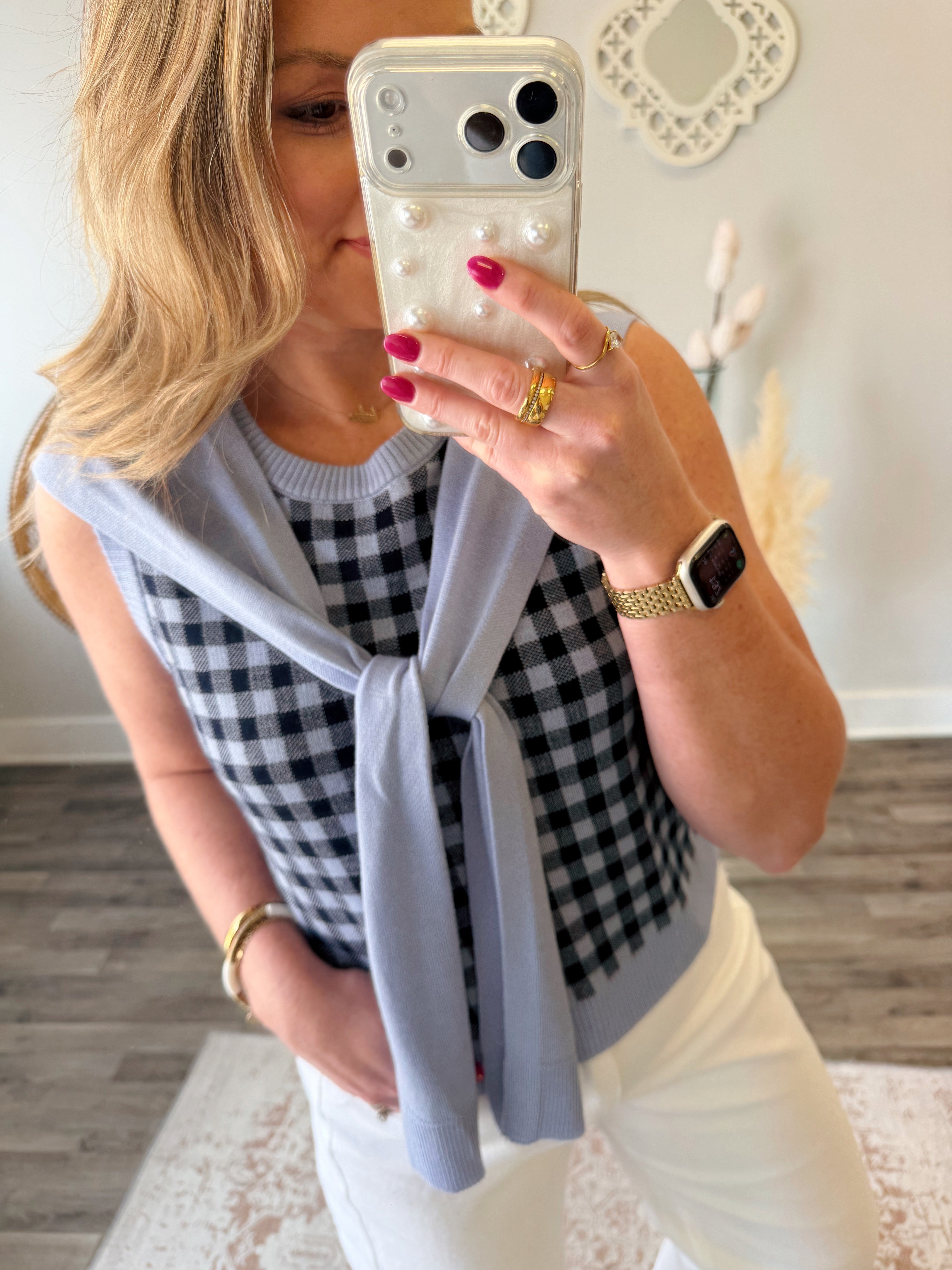 The Margot Top is a charming blend of classic gingham and modern knit styling. Designed in a lightweight sweater knit, this sleeveless top features an attached draped sweater detail that ties at the front for an effortlessly layered look without the bulk. Finished with ribbed trim at the neckline and hem, it’s an easy statement piece with a soft, feminine feel.