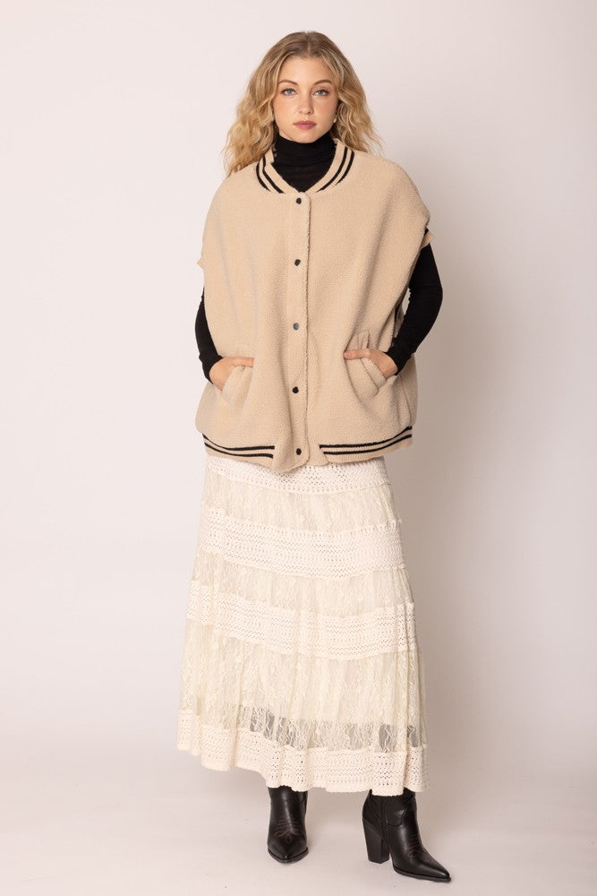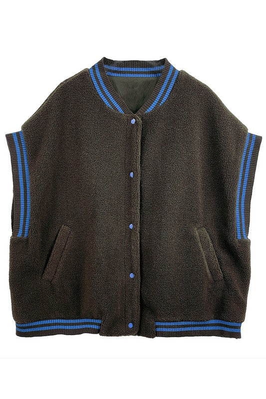 Elevate your casual layers with this oversized varsity-inspired poncho featuring front buttons, roomy pockets, and striped trim details. Cozy yet sporty, it's the perfect blend of comfort and cool for everyday wear or transitional weather styling.