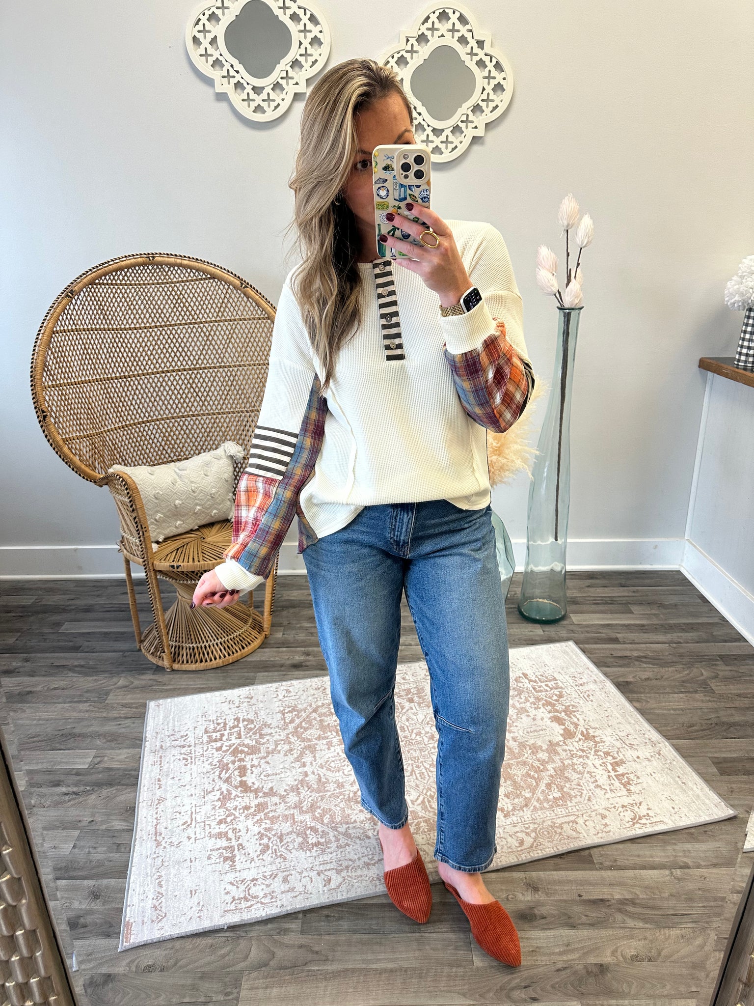 Waffle Stripe Plaid Patchwork Henley Knit Top