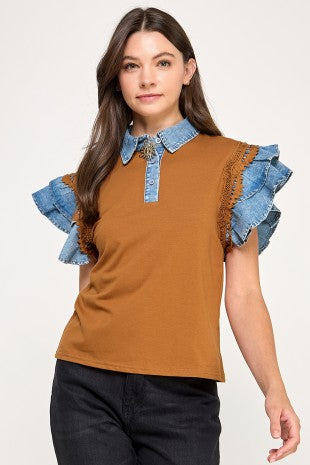 Ruffle Slv Denim Point Collar Top
