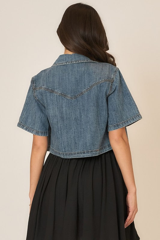Washed Denim Cropped Short Sleeve Button Up Top