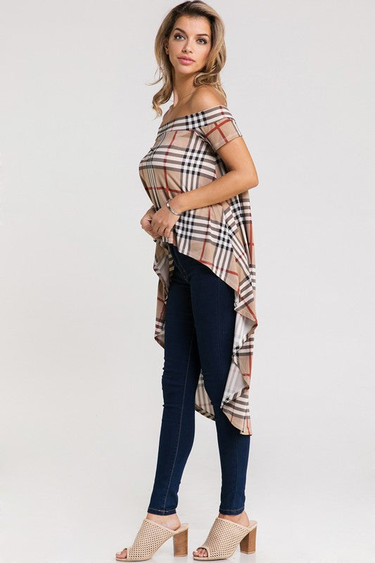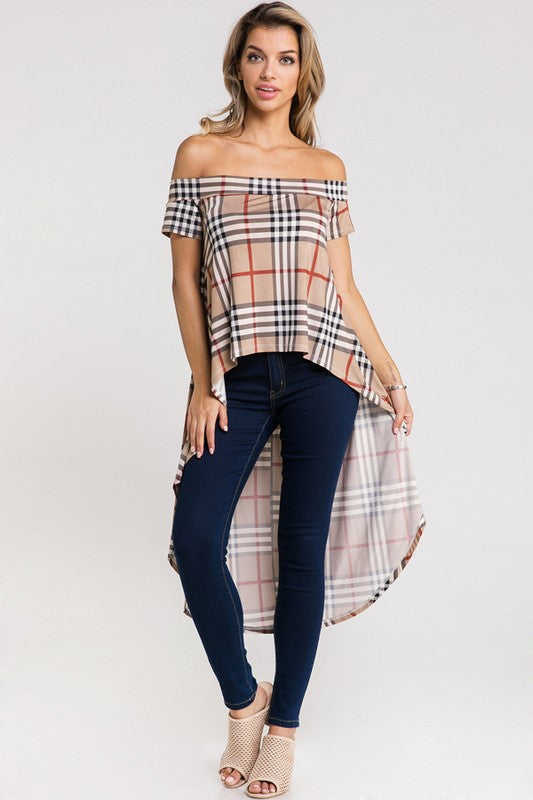 - Flirty and chic off shoulder top with a high low hem worn perfect with any bottom